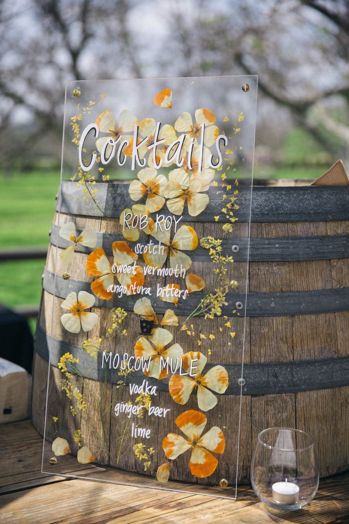 This signature cocktail menu, however, is a bit more detailed and did take me a touch longer than the five minutes I dedicated to the aforementioned chalkboard. The bride and her father made this stunning pressed flower, acrylic wonder along with two others not pictured. The materials used were plexiglass panels, a drill, metal fasteners, and vibrant handpicked blossoms. All I did was offer up my handwriting and basic illustration skills. In all my years of arts and crafts, I think this sign may just be the prettiest things I’ve ever helped create.