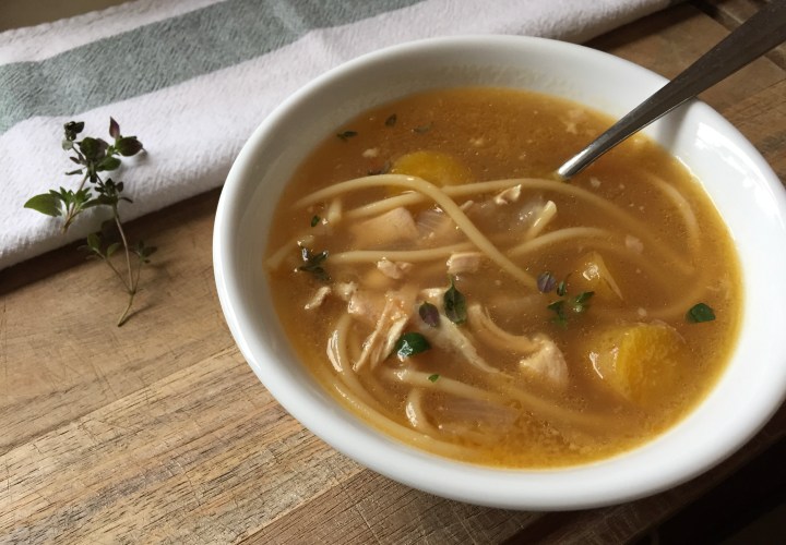 Whenever I buy a rotisserie chicken, I make a large pot of stock once the bird’s been fully eaten. A few months ago, before we were able to devour the entire hen, I decided to use the remaining breast meat and some fresh thyme growing in my garden to put together an elevated chicken noodle soup perfect for any season. Keep reading to discover my easy to follow recipe.