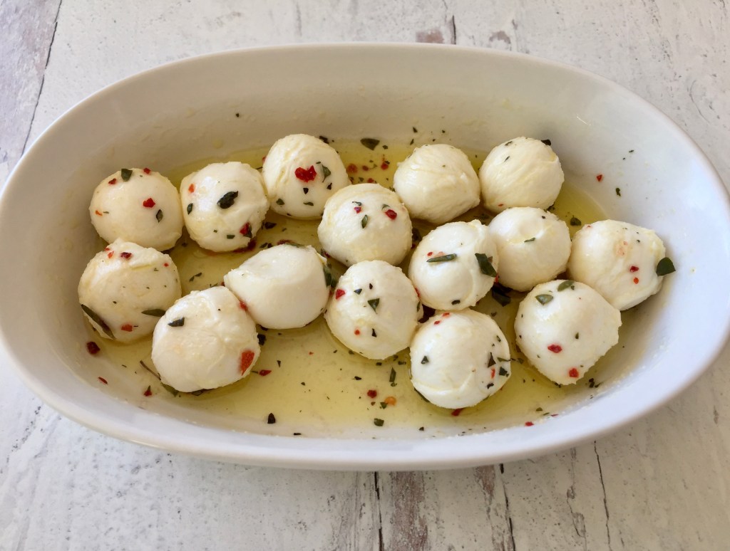 Create a marinade for your fresh mozzarella balls by mixing the extra virgin olive oil, garlic powder, dried oregano, crushed red pepper, salt, and black pepper in a bowl.