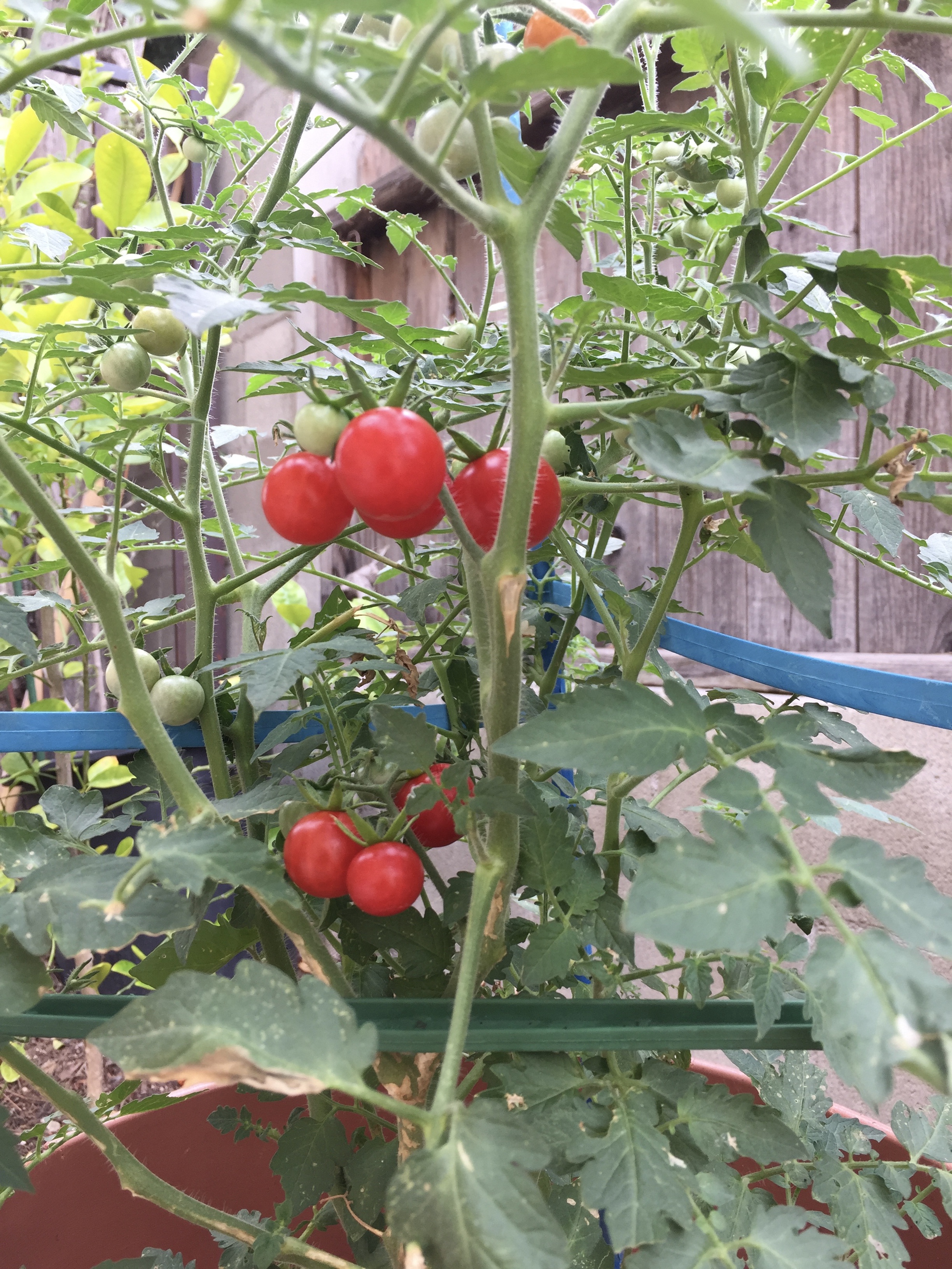When my tomato plants had officially succumb to the heat & wilted away for the season – I ripped out the stalks from their giant pots since I tend to plant new tomatoes from seed and start every spring. Before I could throw away all of my scraps into the green bin, my boyfriend buried one, wrinkly pale orange tomato back into the empty pot. Within a few weeks, we had a baby plant sprouting up, and now in October we have a two-foot friend with bright red fruit ready to be harvested.