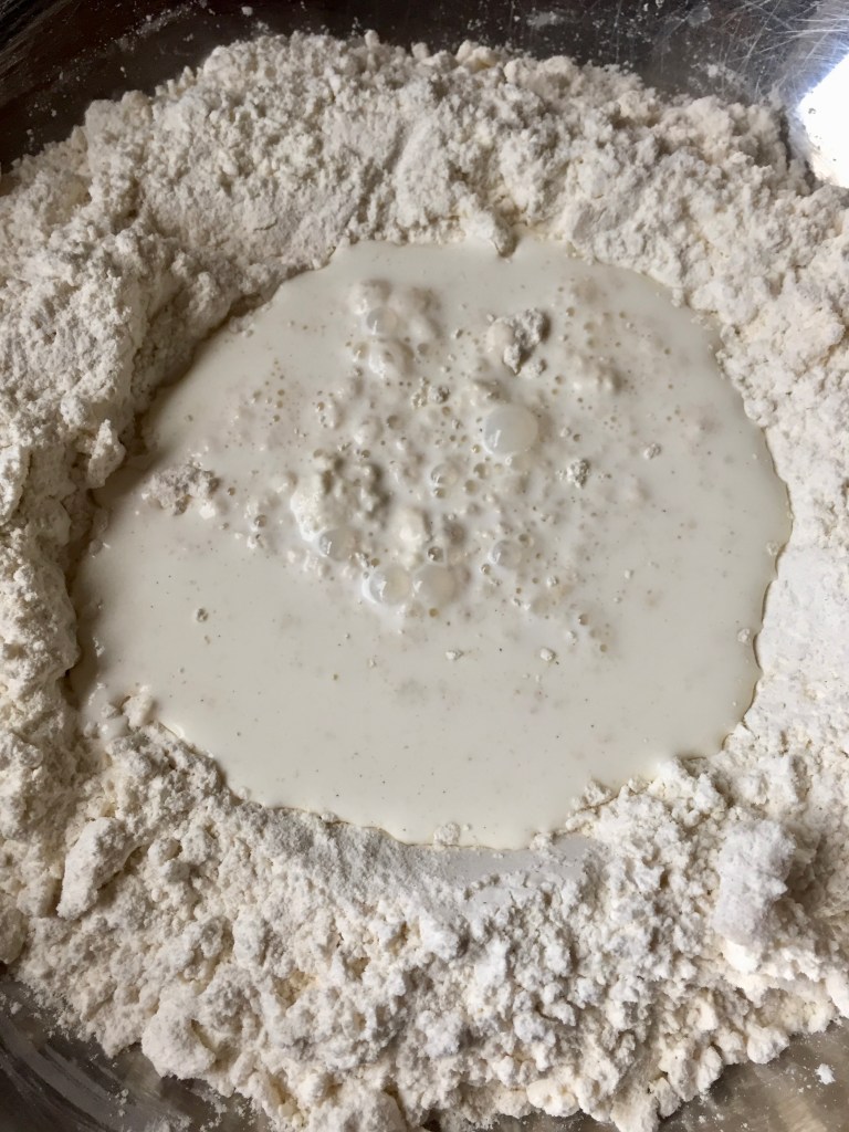 Make a shallow well in the center of the biscuit mix, and pour in your homemade buttermilk. Gently stir everything together until you have a wet, sticky dough. Be careful not to overmix in order to keep your biscuits nice and flaky.