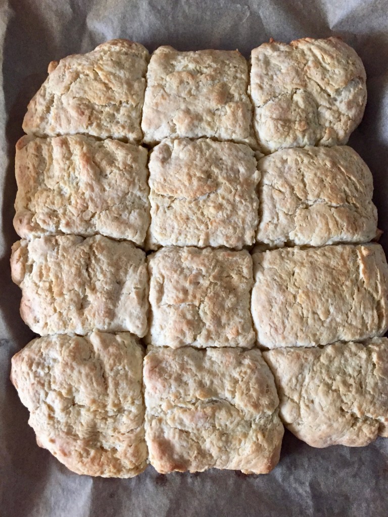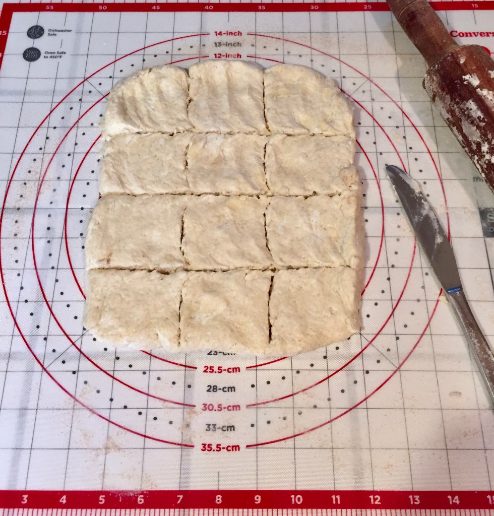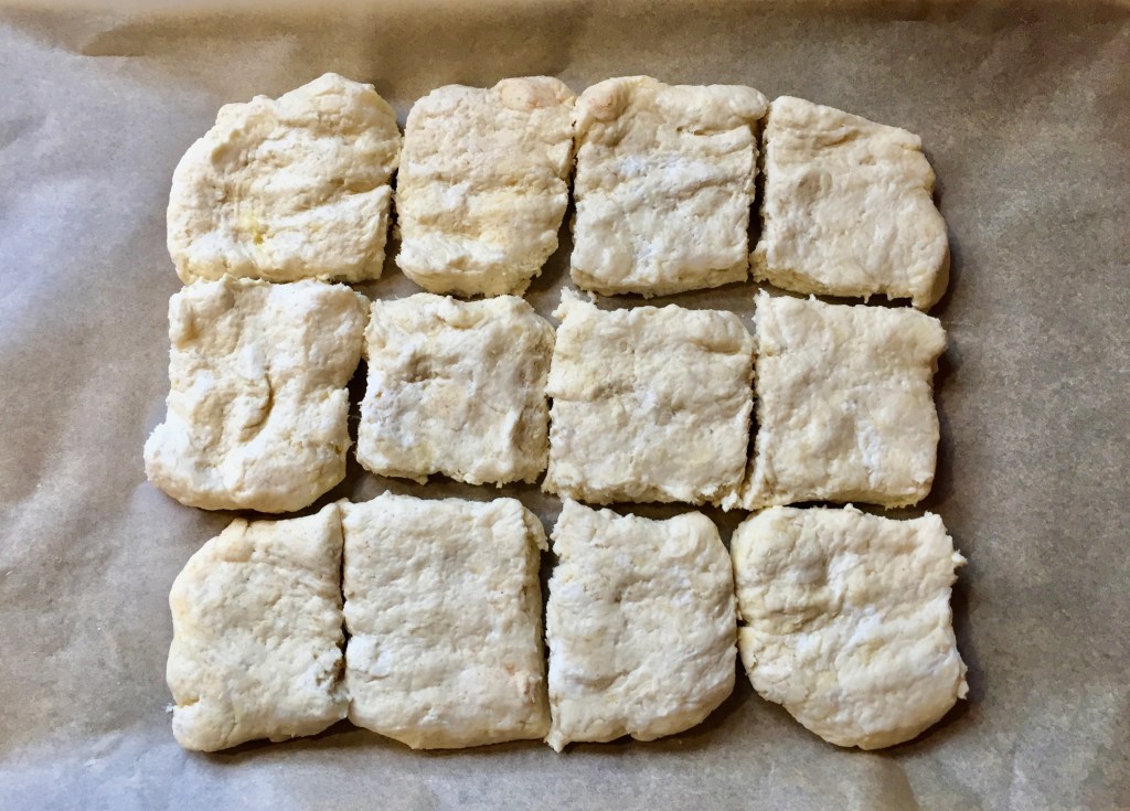 Instead of using a biscuit cutter or cup, I decided to quickly shape the rolled out dough into a rectangle. I then cut out my twelve biscuits with the back of the dinner knife that I used earlier to cube my butter.
