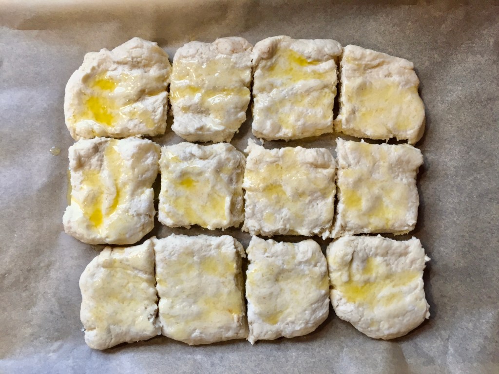 Place your cut biscuits onto a parchment lined baking sheet. The instructions recommend that they touch, hence the reason I have them so close together on the pan. Top the biscuits with 2 tablespoons of melted butter before placing them into the oven.
