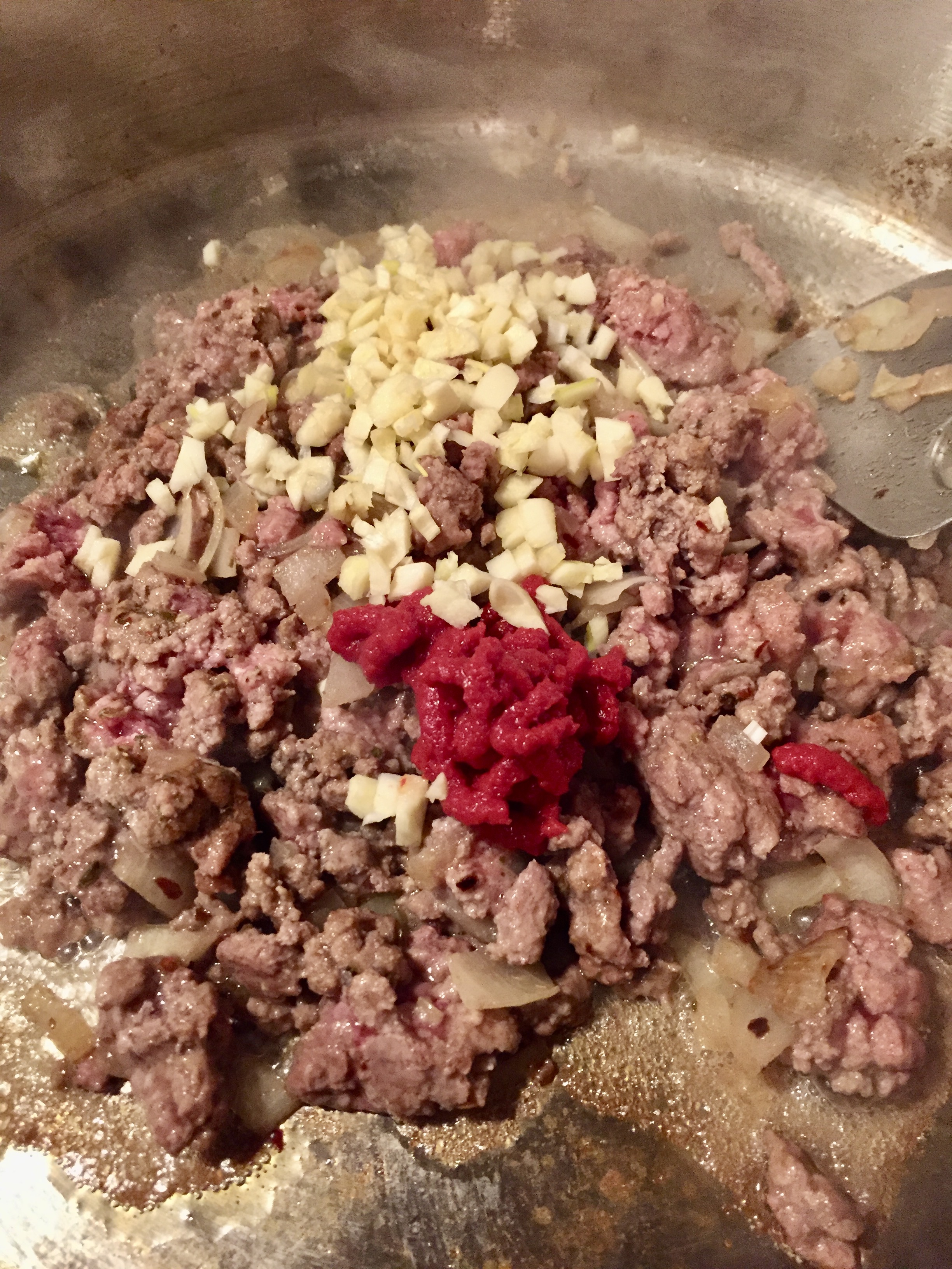 Once the protein has browned, lower the heat, and add in your tomato paste and fresh garlic.