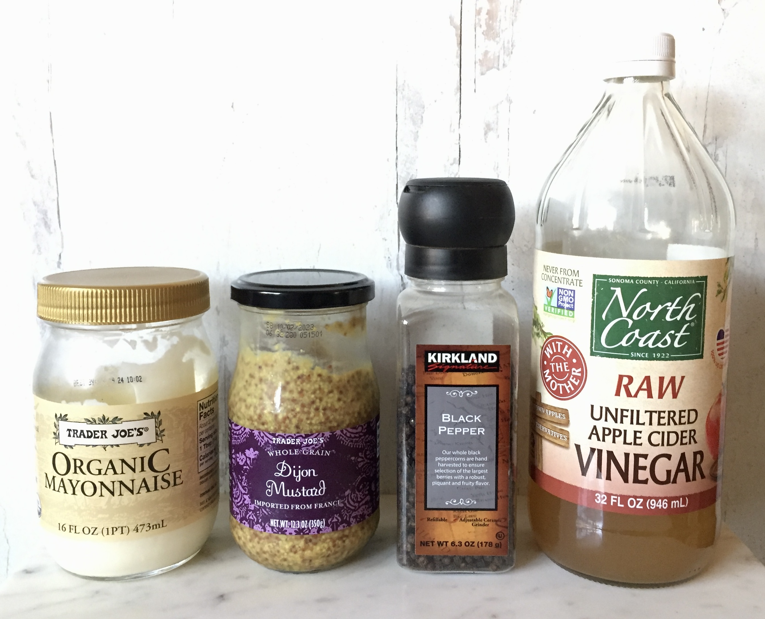The mayo will add creaminess and depth to the dressing while the whole grain mustard will add literal pops of flavor and a bit of tang. Finally, the apple cider vinegar brings in the sweet acidic notes that tie everything together.