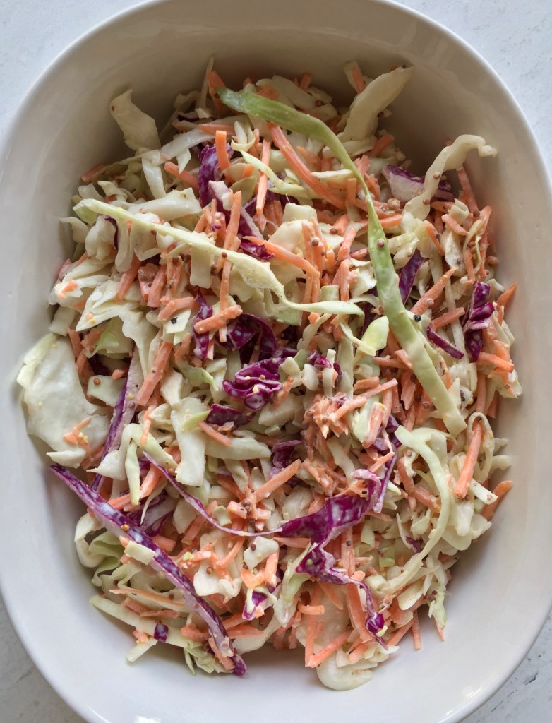 NOTE: If you prefer your coleslaw to be a bit more dressed, just add in a touch more mayo and a splash more apple cider vinegar! You’re the one who’s going to eat it after all so please make it to your preference 🙂