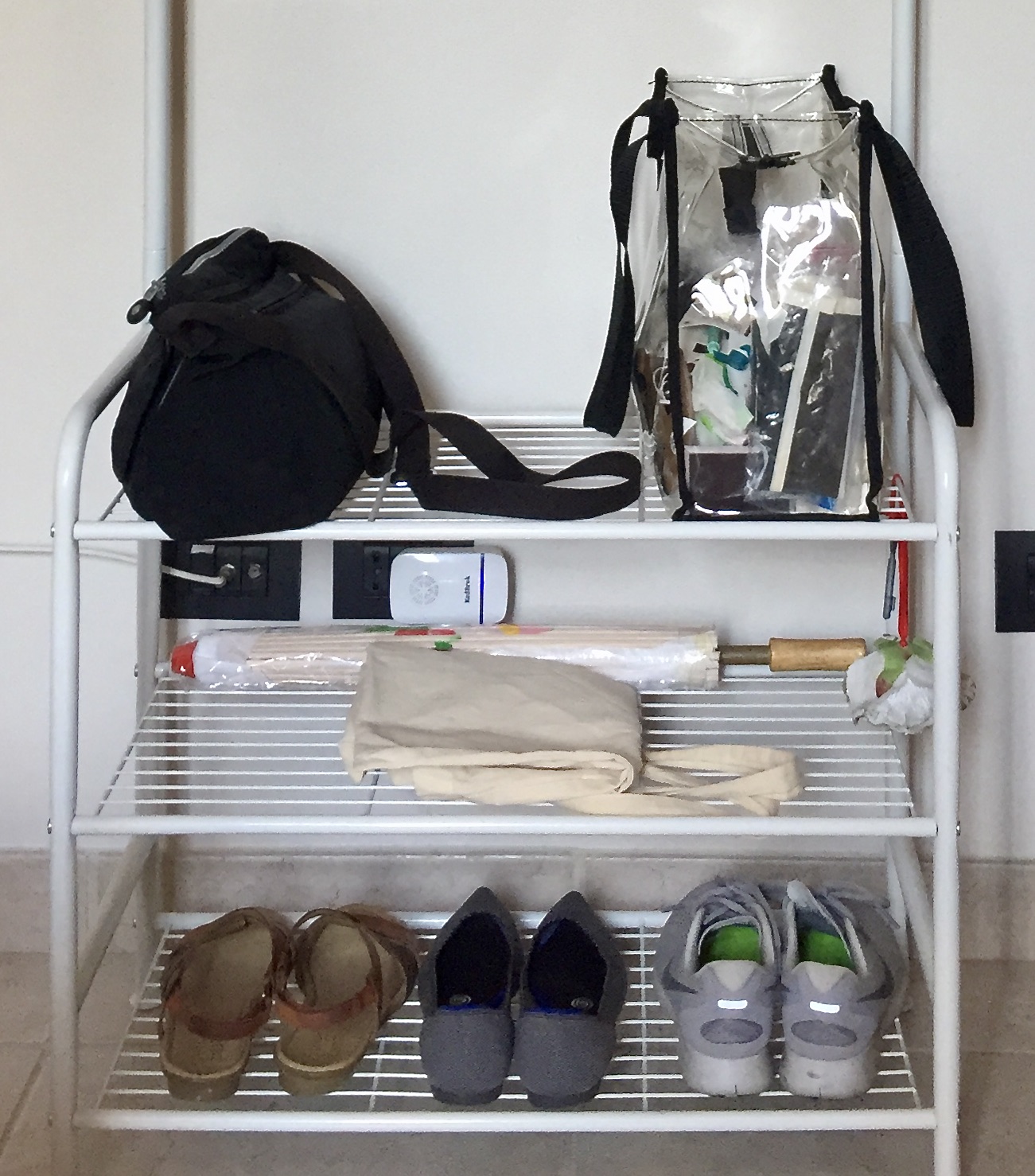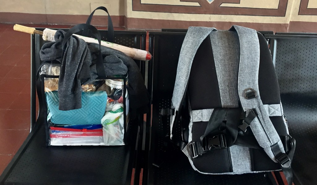 Travel Backpack > 1 small, 27-liter backpack that meets European carry-on parameters. It includes a compressible “carry-on closet” and can expand to 35 liters. The actual bag is called the Lifepack Endeavor and is made by a company called Solgaard. This durable yet sleek-looking backpack has suited me quite well thus far. Clear PVC Tote > 1 stadium approved bag designed for American sporting events with strict requirements. This serves as my one personal item while flying. Black Purse > 1 small, cross-body bag for daily life that I stuff into my PVC tote while flying. Canvas Tote > 1 small fabric bag for beach days that I fold and pack into my backpack or PVC tote while traveling.