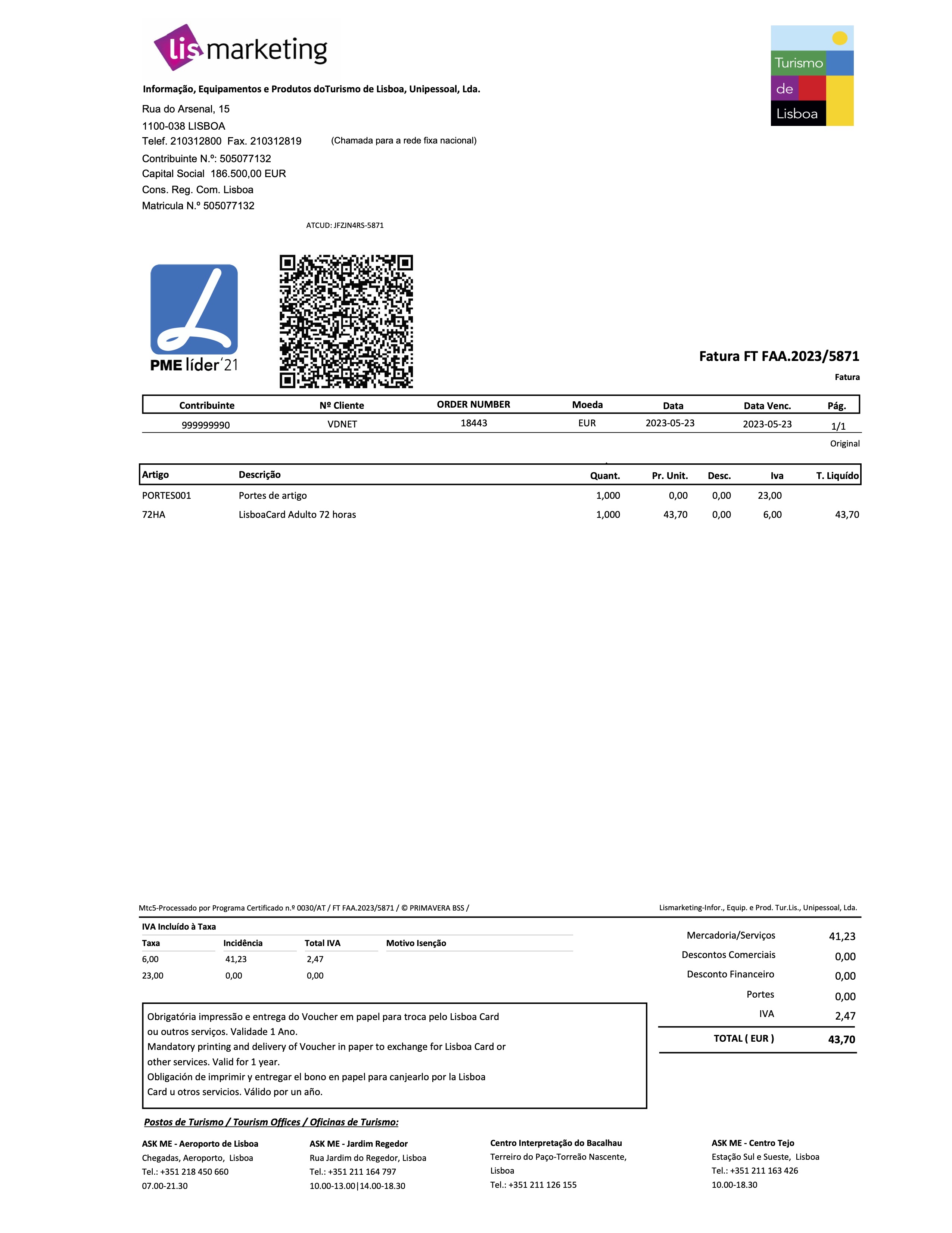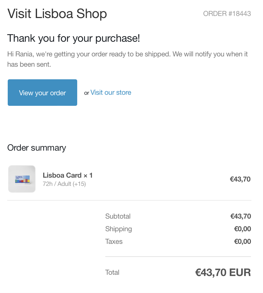 - Email 2: “Order Invoice” from VisitLisboa.com [ no-reply@visitlisboa.com ] This second email contains a PDF file. Per the instructions, I printed this PDF prior to flying into Portugal and brought it with me to the tourism office as proof of purchase when I went to pick up my physical Lisboa Card. I also saved the PDF on my smart phone, and of course – saved both confirmation emails in my inbox as well just in case.